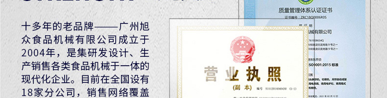 廣州旭眾食品機(jī)械有限公司是一家集科研開發(fā),生產(chǎn)設(shè)計(jì),營(yíng)銷服務(wù)為一體的現(xiàn)代化生產(chǎn)企業(yè)?,F(xiàn)代化生產(chǎn)車間,精湛制造技術(shù),所產(chǎn)機(jī)械歷經(jīng)市場(chǎng)重重考驗(yàn),不斷贏得海內(nèi)外客戶的贊譽(yù)。