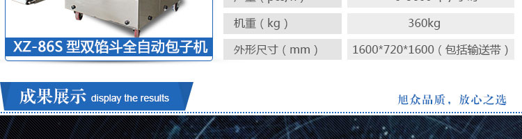 名稱(chēng)XZ-86S型雙餡斗全自動(dòng)包子機(jī) 電源220/380V(見(jiàn)機(jī)器名牌) 功率2.4kw 產(chǎn)量0-3600個(gè)/小時(shí) 尺寸1600*720*1600mm(包括輸送帶) 重量360kg 規(guī)格20-150克/個(gè) 其他