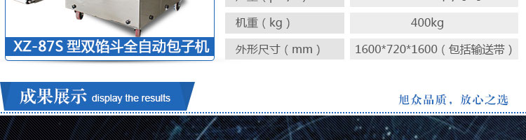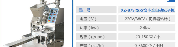 名稱XZ-87S型雙餡斗全自動(dòng)包子機(jī) 電源220/380V(見(jiàn)機(jī)器名牌) 功率2.4kw 產(chǎn)量0-3600個(gè)/小時(shí) 尺寸1600*720*1600mm(包括輸送帶) 重量400kg 規(guī)格20-150克/個(gè) 其他