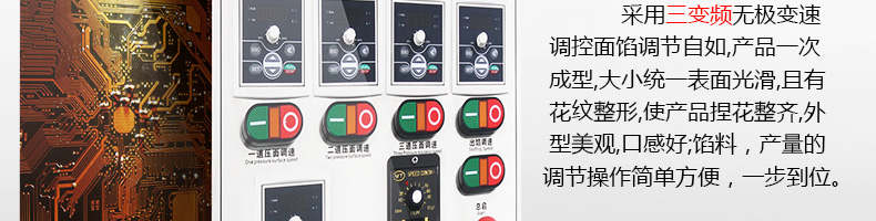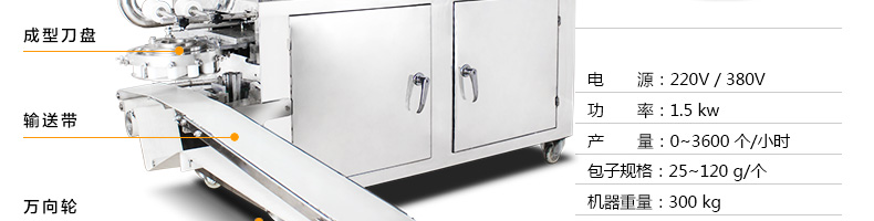 名稱290III卷面式包子機 電源220/380V(見機器名牌) 功率2.4kw 產(chǎn)量0-3600個/小時 尺寸2050*1470*1480mm(包括輸送帶) 重量400kg 規(guī)格25-130克/個 其他