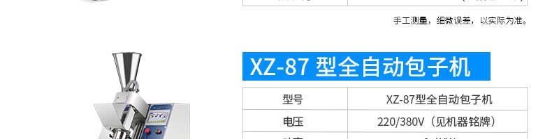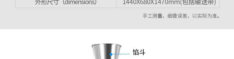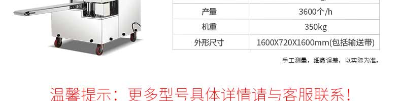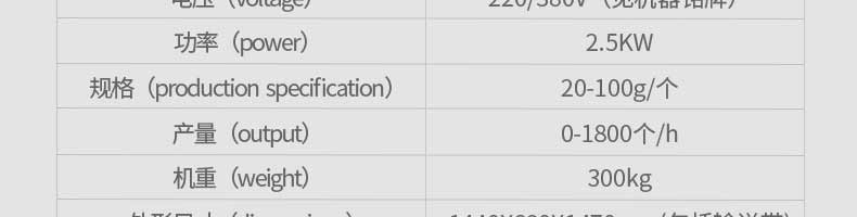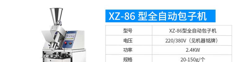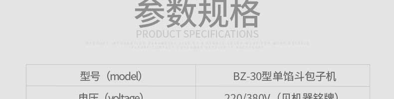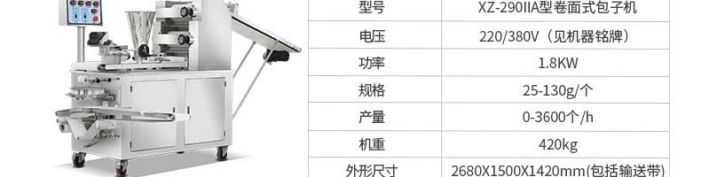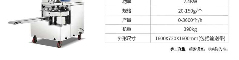 名稱旭眾30單餡斗包子機(jī) 電源220/380V(見(jiàn)機(jī)器名牌) 功率2.5kw 產(chǎn)量0-1800個(gè)/小時(shí) 尺寸1440*680*1420mm(包括輸送帶) 重量300KG 規(guī)格20-100克/個(gè) 其他