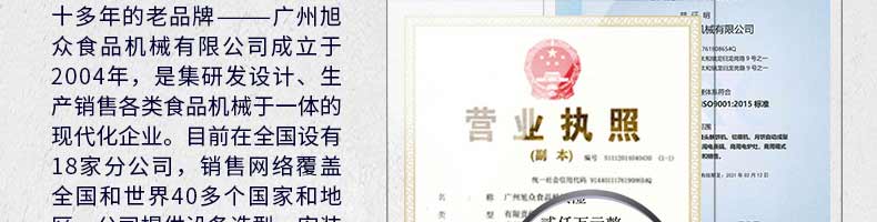 廣州旭眾食品機(jī)械有限公司是一家集科研開(kāi)發(fā),生產(chǎn)設(shè)計(jì),營(yíng)銷服務(wù)為一體的現(xiàn)代化生產(chǎn)企業(yè)?,F(xiàn)代化生產(chǎn)車間,精湛制造技術(shù),所產(chǎn)機(jī)械歷經(jīng)市場(chǎng)重重考驗(yàn),不斷贏得海內(nèi)外客戶的贊譽(yù)。