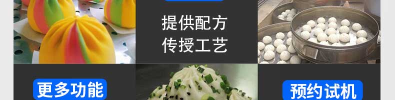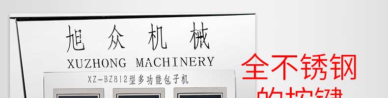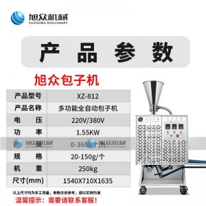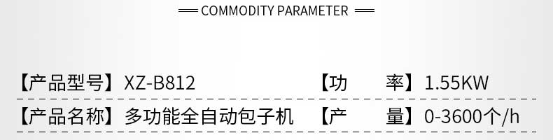 名稱XZ-B812型多功能包子機(jī) 電源220V/380V 功率1.55KW 產(chǎn)量0-3600個/h 尺寸1540×710×1635mm 重量250kg 規(guī)格25-130g/個 其他