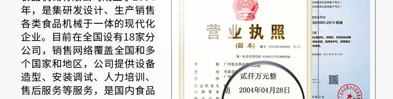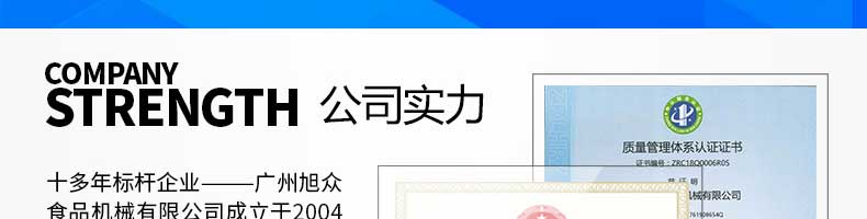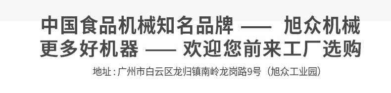 廣州旭眾食品機(jī)械有限公司是一家集科研開發(fā),生產(chǎn)設(shè)計,營銷服務(wù)為一體的現(xiàn)代化生產(chǎn)企業(yè)?,F(xiàn)代化生產(chǎn)車間,精湛制造技術(shù),所產(chǎn)機(jī)械歷經(jīng)市場重重考驗,不斷贏得海內(nèi)外客戶的贊譽(yù)。
