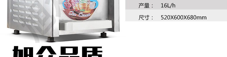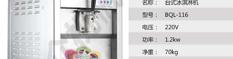 名稱BQL-116臺式冰淇淋機 電源220V 功率1.36kw 產(chǎn)量14-16L/H 尺寸520*600*680mm 重量70kg 規(guī)格 其他