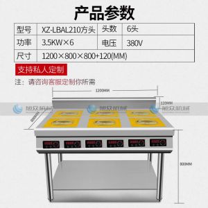 名稱XZ-LBZL210六個(gè)方頭電陶爐 電源380v 功率3.5KW*6 產(chǎn)量聯(lián)系銷售員 尺寸1200×800×800+120MM 重量聯(lián)系銷售員 規(guī)格頭數(shù):6頭 其他