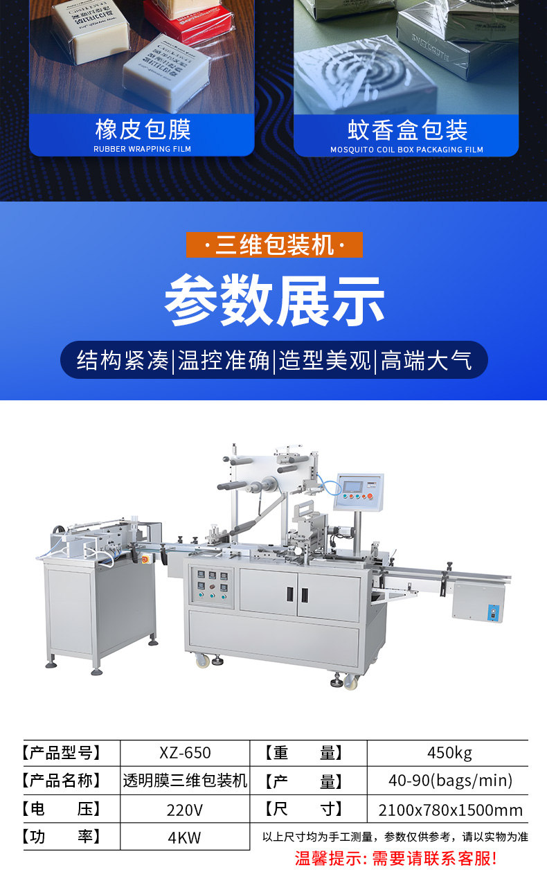 XZ-650包裝機(jī),三維包裝機(jī),全自動(dòng)化操作出膜、切膜、包膜、熱封一次完成。可廣泛應(yīng)用多種產(chǎn)品,適用包裝的產(chǎn)品有食品、撲克牌、香煙盒化妝品、日用品、文具用品等類型產(chǎn)品。