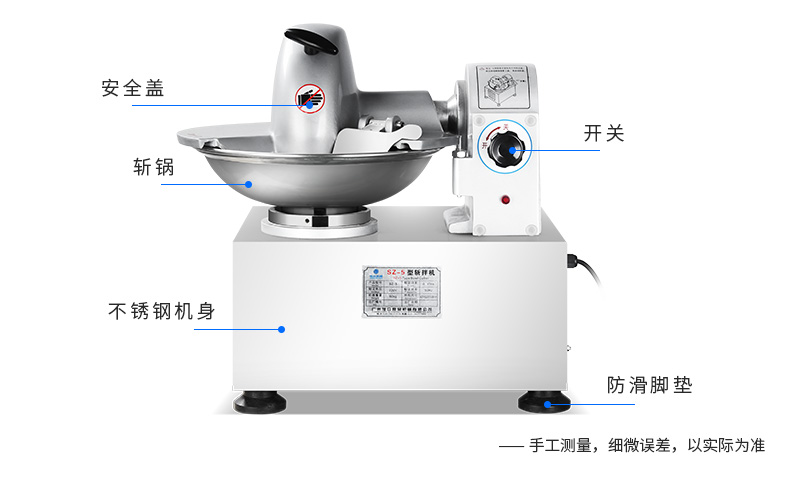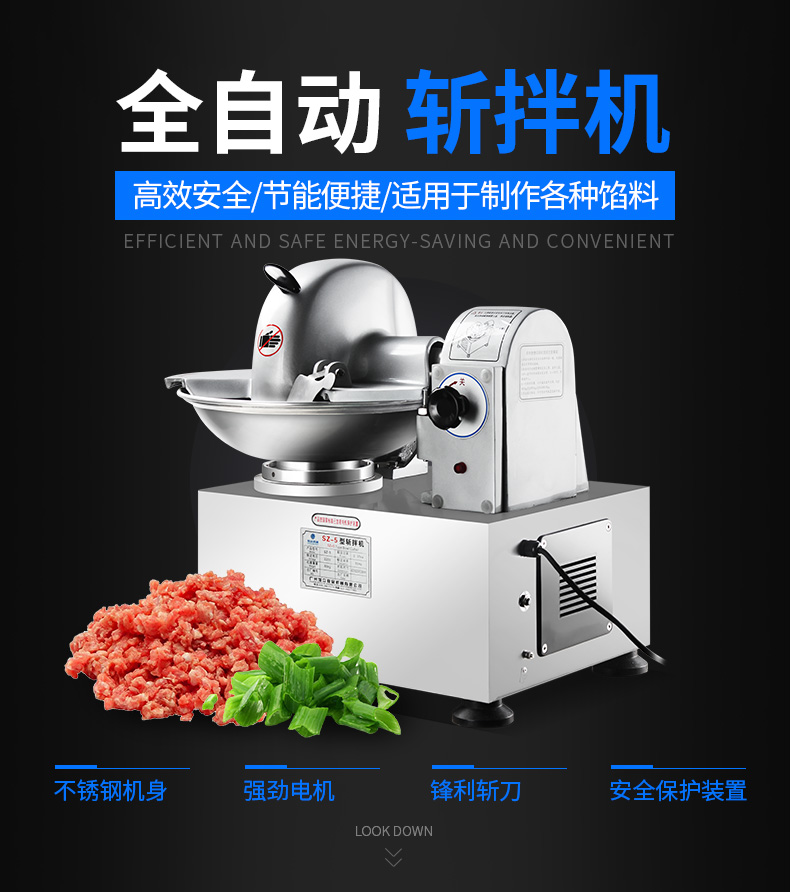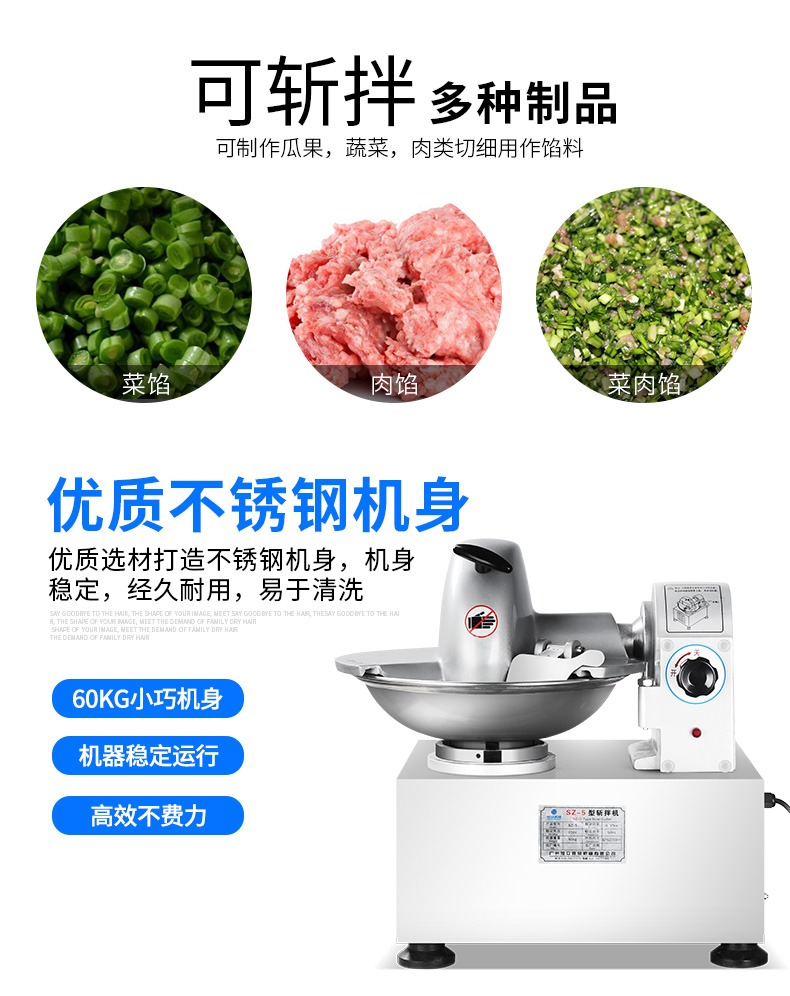 SZ-5型斬拌機(jī),全自動斬拌機(jī),高效安全、節(jié)能便捷、適用于制作各種餡料。可斬拌多種制品,可制作瓜果,蔬菜,肉類切細(xì)用作餡料。優(yōu)質(zhì)選材打造不銹鋼機(jī)身,機(jī)身穩(wěn)定,經(jīng)久耐用,易于清洗。
