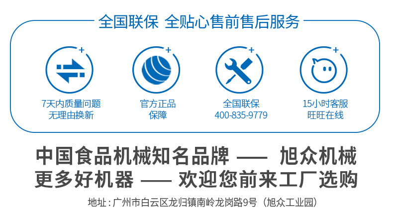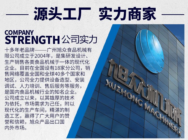 廣州旭眾食品機(jī)械有限公司是一家集科研開發(fā),生產(chǎn)設(shè)計,營銷服務(wù)為一體的現(xiàn)代化生產(chǎn)企業(yè)。現(xiàn)代化生產(chǎn)車間,精湛制造技術(shù),所產(chǎn)機(jī)械歷經(jīng)市場重重考驗,不斷贏得海內(nèi)外客戶的贊譽(yù)。