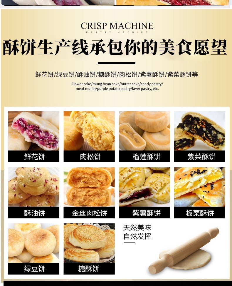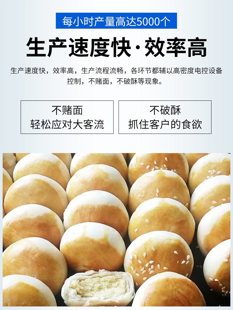 蛋黃酥生產(chǎn)線,酥餅生產(chǎn)線承包你的美食愿望。鮮花餅、綠豆餅、酥油餅、糖酥餅、肉松餅、紫薯酥餅、紫菜酥餅等。每小時產(chǎn)量高達5000個,生產(chǎn)速度快、效率高。