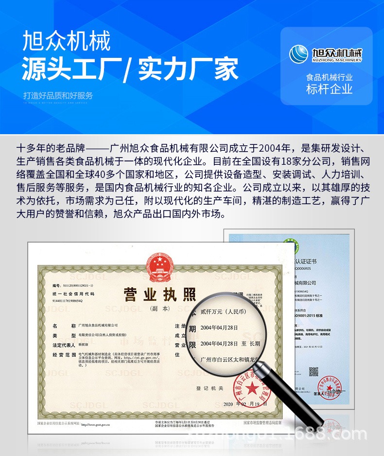 廣州旭眾食品機械有限公司是一家集科研開發(fā),生產設計,營銷服務為一體的現(xiàn)代化生產企業(yè)。現(xiàn)代化生產車間,精湛制造技術,所產機械歷經市場重重考驗,不斷贏得海內外客戶的贊譽。