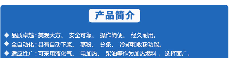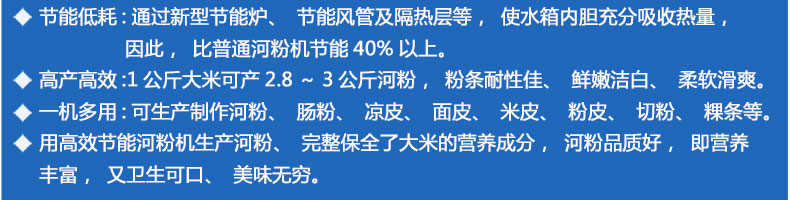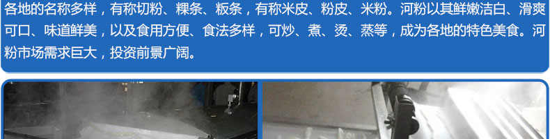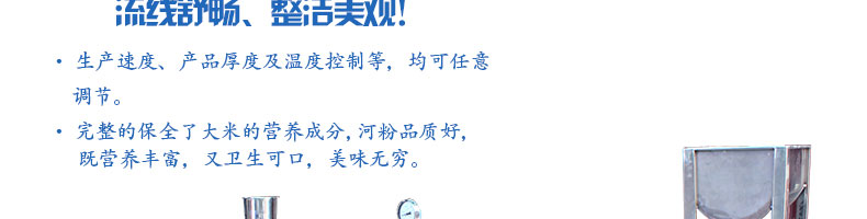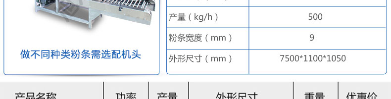 名稱SZ-HF-500高效節(jié)能河粉機(jī) 電源220V 功率1.1kw 產(chǎn)量240/300/400/500kg/h 尺寸主機(jī)尺寸7500*1000*1050mm 外形尺寸7600*1200*1500mm 重量650kg 規(guī)格粉條寬度mm:4/6/8/10 其他