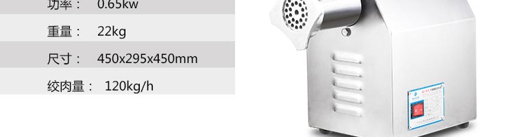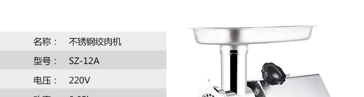 名稱SZ-12A 絞肉機 電源220v 功率0.65kw 產(chǎn)量120kg 尺寸450*295*450mm 重量22kg 規(guī)格 其他