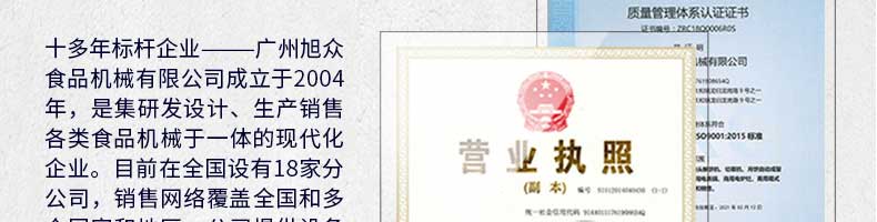廣州旭眾食品機械有限公司是一家集科研開發(fā),生產(chǎn)設(shè)計,營銷服務(wù)為一體的現(xiàn)代化生產(chǎn)企業(yè)。現(xiàn)代化生產(chǎn)車間,精湛制造技術(shù),所產(chǎn)機械歷經(jīng)市場重重考驗,不斷贏得海內(nèi)外客戶的贊譽。