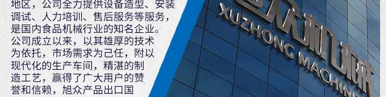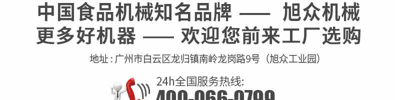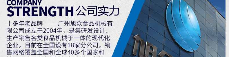 廣州旭眾食品機械有限公司是一家集科研開發(fā),生產(chǎn)設(shè)計,營銷服務(wù)為一體的現(xiàn)代化生產(chǎn)企業(yè)。現(xiàn)代化生產(chǎn)車間,精湛制造技術(shù),所產(chǎn)機械歷經(jīng)市場重重考驗,不斷贏得海內(nèi)外客戶的贊譽。