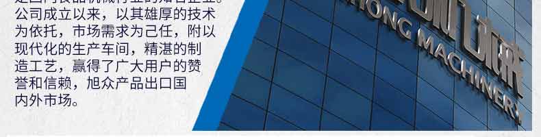 廣州旭眾食品機械有限公司是一家集科研開發(fā),生產(chǎn)設(shè)計,營銷服務(wù)為一體的現(xiàn)代化生產(chǎn)企業(yè)。現(xiàn)代化生產(chǎn)車間,精湛制造技術(shù),所產(chǎn)機械歷經(jīng)市場重重考驗,不斷贏得海內(nèi)外客戶的贊譽。