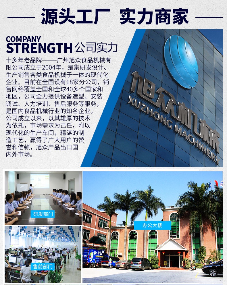 廣州旭眾食品機(jī)械有限公司是一家集科研開發(fā),生產(chǎn)設(shè)計(jì),營銷服務(wù)為一體的現(xiàn)代化生產(chǎn)企業(yè)?,F(xiàn)代化生產(chǎn)車間,精湛制造技術(shù),所產(chǎn)機(jī)械歷經(jīng)市場重重考驗(yàn),不斷贏得海內(nèi)外客戶的贊譽(yù)。