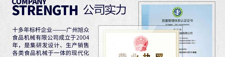 廣州旭眾食品機(jī)械有限公司是一家集科研開發(fā),生產(chǎn)設(shè)計(jì),營銷服務(wù)為一體的現(xiàn)代化生產(chǎn)企業(yè)?,F(xiàn)代化生產(chǎn)車間,精湛制造技術(shù),所產(chǎn)機(jī)械歷經(jīng)市場重重考驗(yàn),不斷贏得海內(nèi)外客戶的贊譽(yù)。