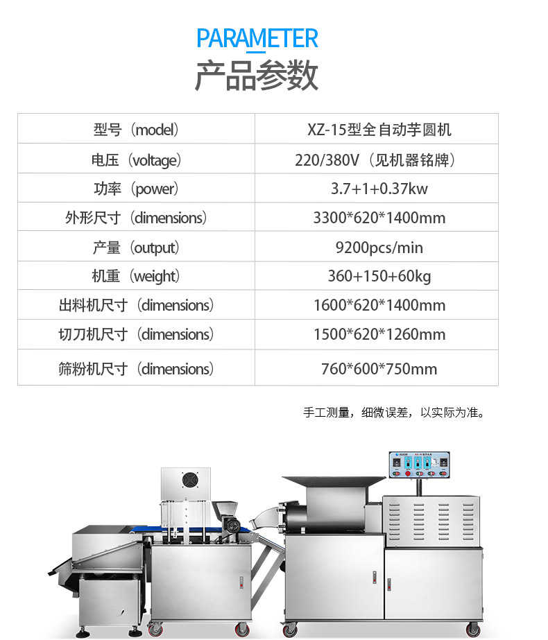 名稱XZ-15 芋圓機(jī) 電源220/380V(見機(jī)器銘牌) 功率3.7+1+0.37kW 產(chǎn)量9200pcs/min 尺寸3300*620*1400mm 重量360+150+60kg 規(guī)格聯(lián)系銷售員 其他