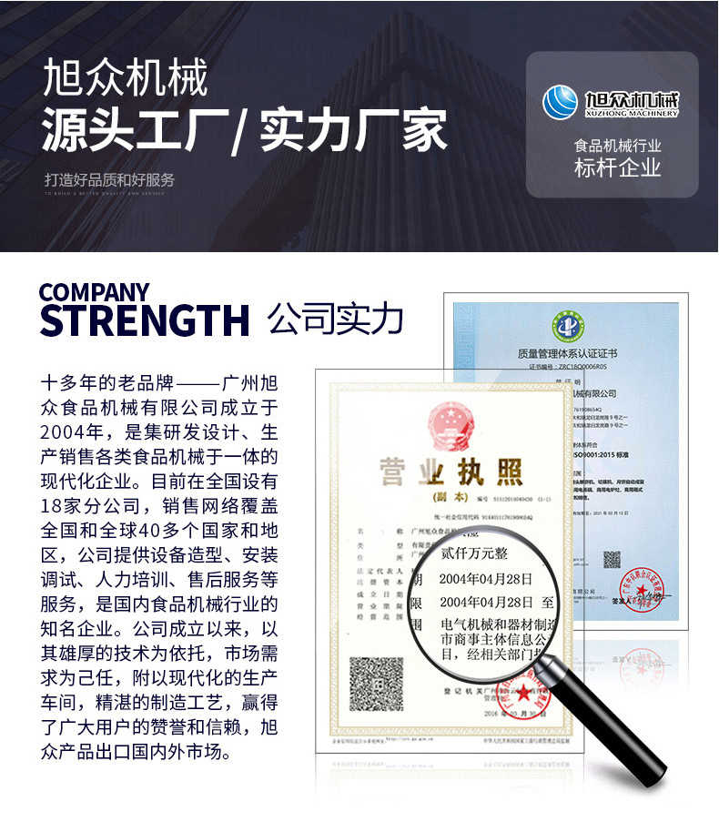 廣州旭眾食品機(jī)械有限公司是一家集科研開發(fā),生產(chǎn)設(shè)計(jì),營(yíng)銷服務(wù)為一體的現(xiàn)代化生產(chǎn)企業(yè)?,F(xiàn)代化生產(chǎn)車間,精湛制造技術(shù),所產(chǎn)機(jī)械歷經(jīng)市場(chǎng)重重考驗(yàn),不斷贏得海內(nèi)外客戶的贊譽(yù)。