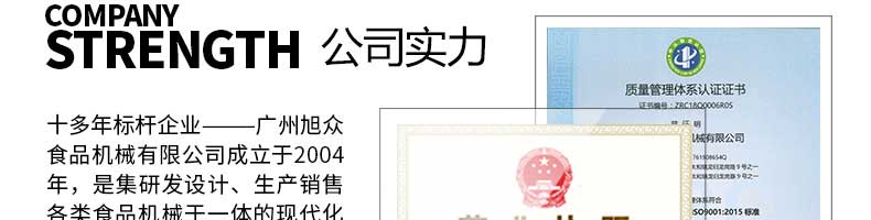 廣州旭眾食品機械有限公司是一家集科研開發(fā),生產設計,營銷服務為一體的現代化生產企業(yè)?,F代化生產車間,精湛制造技術,所產機械歷經市場重重考驗,不斷贏得海內外客戶的贊譽。