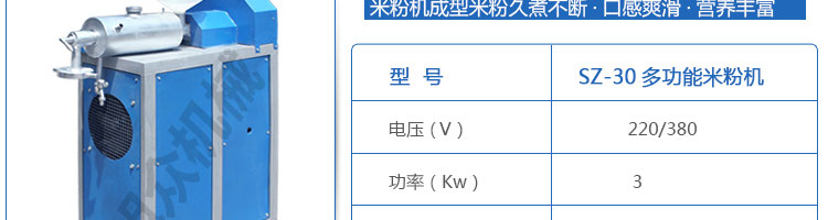 名稱SZ-30米粉機(jī) 電源220/380V 功率3kw 產(chǎn)量30kg/h 尺寸950*400*1270mm 重量80kg 規(guī)格 其他