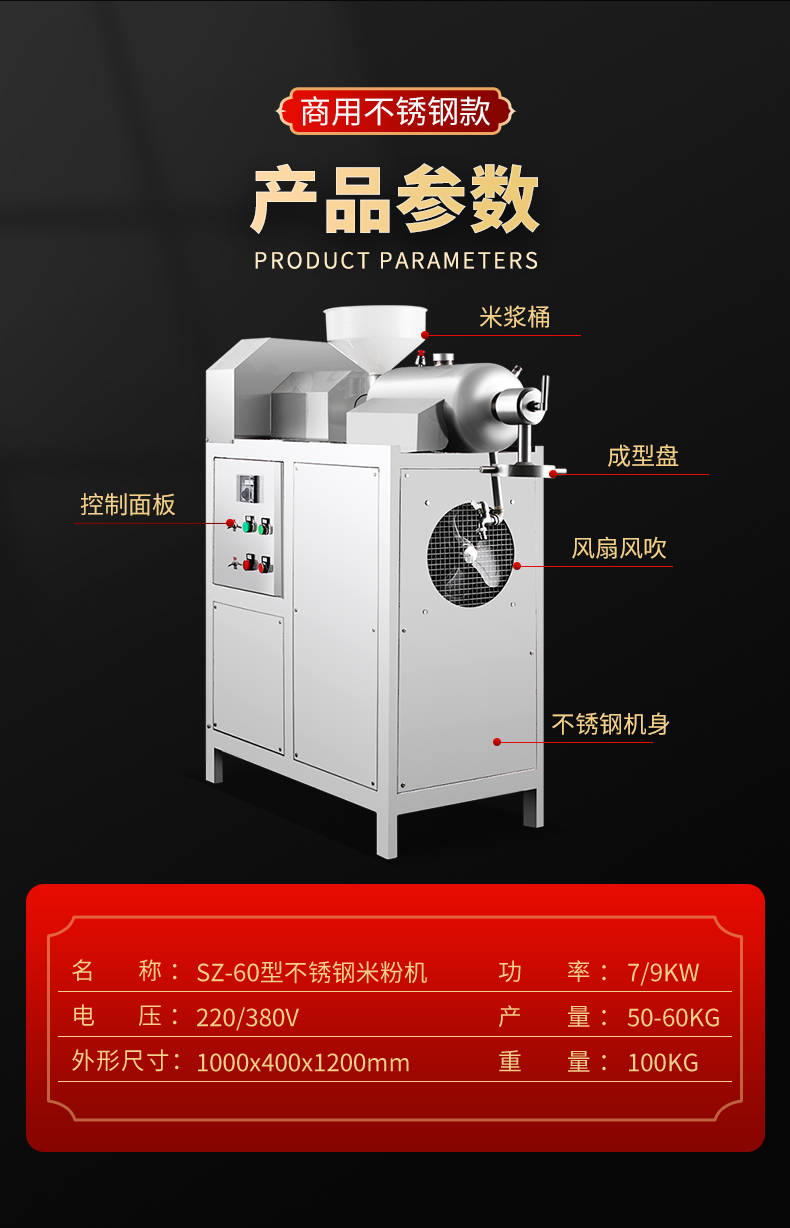 名稱SZ-60不銹鋼米粉機 電源220/380V 功率5.5kw 產(chǎn)量50-60kg/h 尺寸1230*450*1220mm 重量100kg 規(guī)格 其他