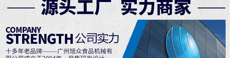 廣州旭眾食品機械有限公司是一家集科研開發(fā),生產(chǎn)設計,營銷服務為一體的現(xiàn)代化生產(chǎn)企業(yè)?,F(xiàn)代化生產(chǎn)車間,精湛制造技術,所產(chǎn)機械歷經(jīng)市場重重考驗,不斷贏得海內外客戶的贊譽。