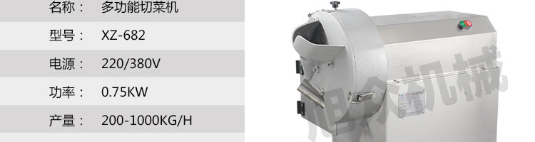 名稱XZ-682多功能切菜機 電源220/380V(見機器銘牌) 功率0.75kw 產(chǎn)量200-1000千克/小時 尺寸770*460*800mm 重量140kg 規(guī)格標配刀具尺寸:切絲:3mm,切片:3mm,切?。?0*10mm。可選的刀具尺寸:切絲:4、5、6mm 其他