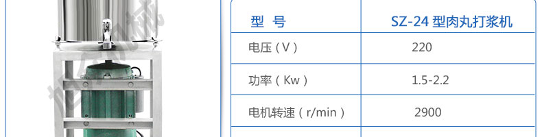 名稱SZ-24型高速肉丸打漿機(jī) 電源220/380V(見機(jī)器銘牌) 功率1.5-2.2kw/3kw 產(chǎn)量6千克/小時(shí) / 10千克/小時(shí) 尺寸355*405*950mm / 800*400*950mm 重量55kg/130kg 規(guī)格 其他