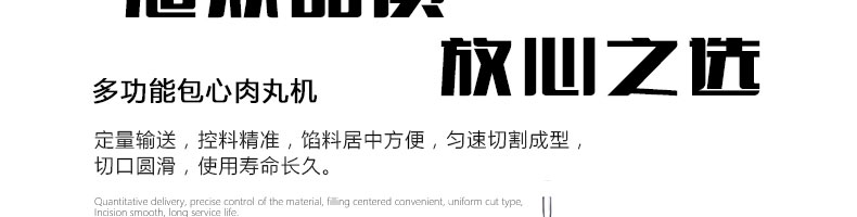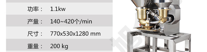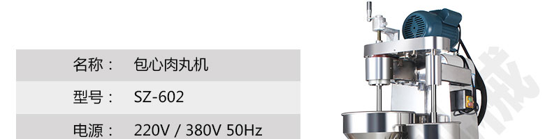 名稱SZ-602包心肉丸機 電源220/380V(見機器銘牌) 功率1.1kw 產(chǎn)量140-420個/分鐘 尺寸770*530*1280mm 重量200kg 規(guī)格 其他