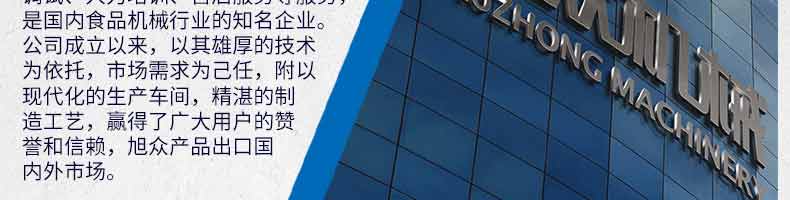 廣州旭眾食品機(jī)械有限公司是一家集科研開發(fā),生產(chǎn)設(shè)計,營銷服務(wù)為一體的現(xiàn)代化生產(chǎn)企業(yè)。現(xiàn)代化生產(chǎn)車間,精湛制造技術(shù),所產(chǎn)機(jī)械歷經(jīng)市場重重考驗,不斷贏得海內(nèi)外客戶的贊譽(yù)。