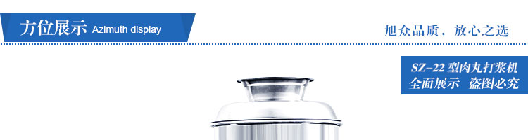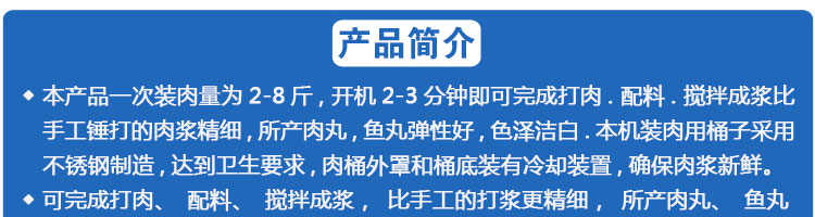 SZ-22型肉丸打漿機,本機裝肉用桶子采用不銹鋼制造,達到衛(wèi)生要求,肉桶外罩和桶底裝有冷卻裝置,確保肉漿新鮮。比手工的打漿更精細,所產肉丸、魚丸彈性好,色澤潔白。