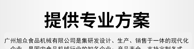 廣州旭眾食品機械有限公司是一家集科研開發(fā),生產(chǎn)設計,營銷服務為一體的現(xiàn)代化生產(chǎn)企業(yè)。現(xiàn)代化生產(chǎn)車間,精湛制造技術,所產(chǎn)機械歷經(jīng)市場重重考驗,不斷贏得海內(nèi)外客戶的贊譽。