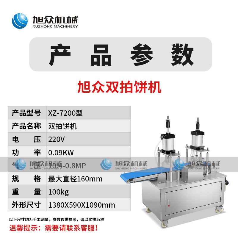 名稱XZ-7200型雙拍餅機 電源220V 功率90W 產(chǎn)量聯(lián)系銷售員 尺寸1380X590X1090mm 重量100kg 規(guī)格最大直徑160mm 其他氣壓:10.40-0.8MP