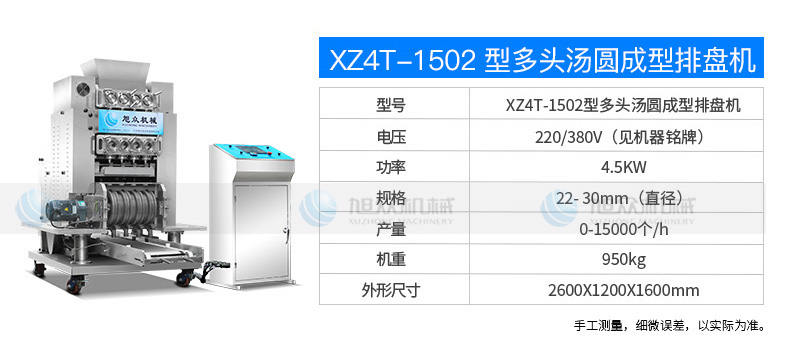 名稱XZ4T -1502多頭湯圓成型排盤機(jī) 電源220/380V(見機(jī)器銘牌) 功率4.5KW 產(chǎn)量0-15000個/h 尺寸2600x1200x1600mm 重量950kg 規(guī)格22-30mm(直徑) 其他