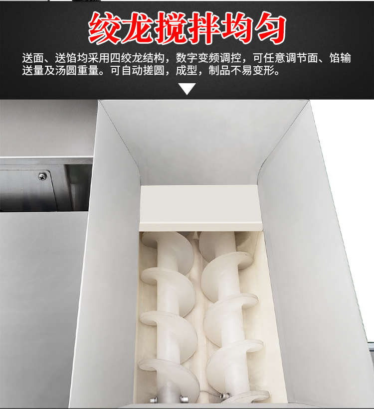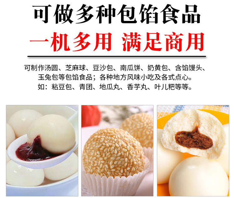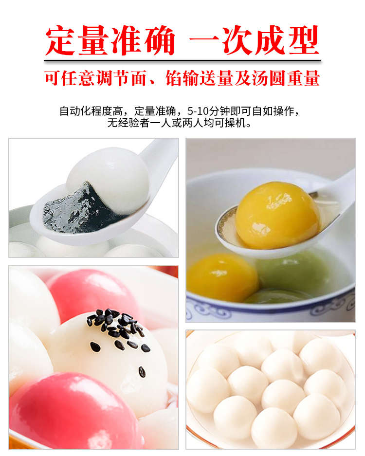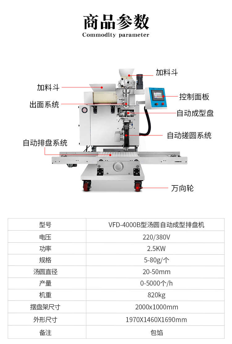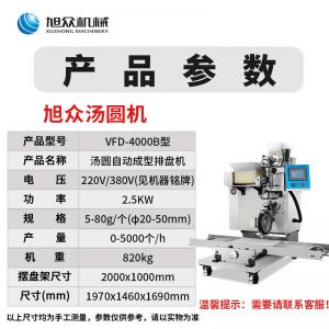 名稱VFD-4000B湯圓機(jī) 電源220/380V 功率2.5KW 產(chǎn)量0-5000個(gè)/h 尺寸1970X1460X1690mm 重量820kg 規(guī)格5-80g/個(gè)(湯圓直徑:20-50mm) 其他包餡