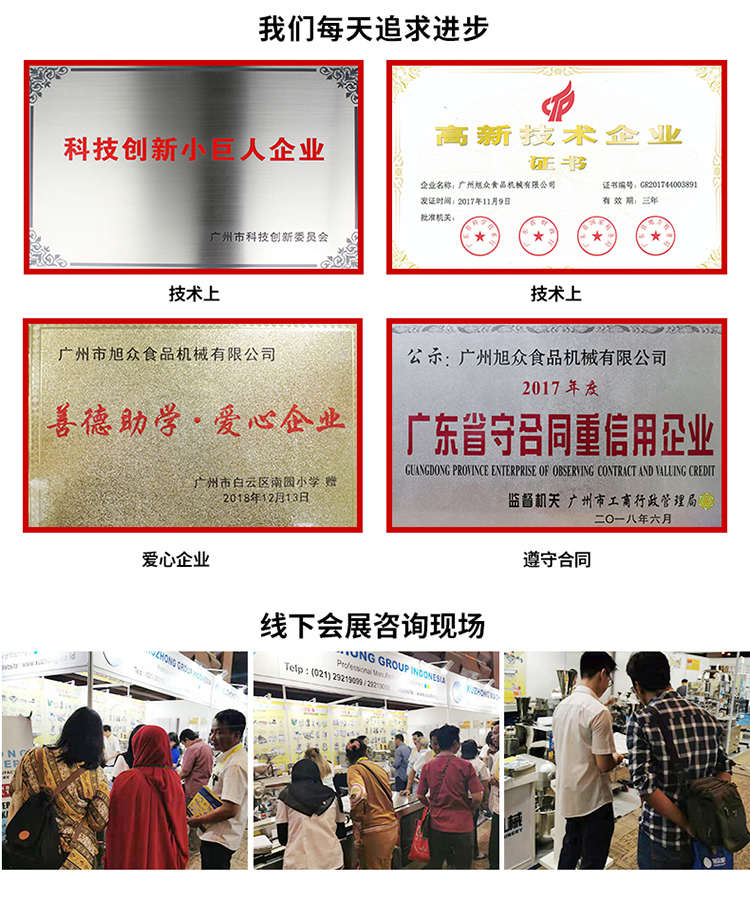 廣州旭眾食品機(jī)械有限公司是一家集科研開發(fā),生產(chǎn)設(shè)計(jì),營銷服務(wù)為一體的現(xiàn)代化生產(chǎn)企業(yè)?,F(xiàn)代化生產(chǎn)車間,精湛制造技術(shù),所產(chǎn)機(jī)械歷經(jīng)市場重重考驗(yàn),不斷贏得海內(nèi)外客戶的贊譽(yù)。