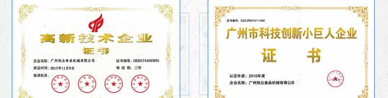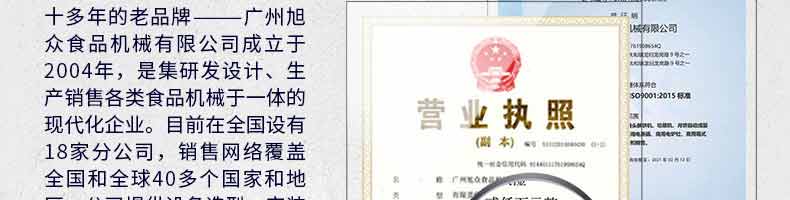 廣州旭眾食品機(jī)械有限公司是一家集科研開發(fā),生產(chǎn)設(shè)計(jì),營銷服務(wù)為一體的現(xiàn)代化生產(chǎn)企業(yè)?,F(xiàn)代化生產(chǎn)車間,精湛制造技術(shù),所產(chǎn)機(jī)械歷經(jīng)市場(chǎng)重重考驗(yàn),不斷贏得海內(nèi)外客戶的贊譽(yù)。
