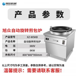 名稱XZ-WSKB自動(dòng)旋轉(zhuǎn)煎包爐 電源380V 功率8KW 產(chǎn)量請(qǐng)咨詢銷售員 尺寸800*800*950mm 重量請(qǐng)咨詢銷售員 規(guī)格請(qǐng)咨詢銷售員 其他