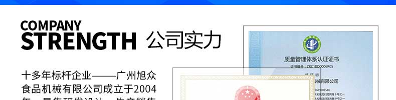 廣州旭眾食品機械有限公司是一家集科研開發(fā),生產(chǎn)設(shè)計,營銷服務(wù)為一體的現(xiàn)代化生產(chǎn)企業(yè)?,F(xiàn)代化生產(chǎn)車間,精湛制造技術(shù),所產(chǎn)機械歷經(jīng)市場重重考驗,不斷贏得海內(nèi)外客戶的贊譽。